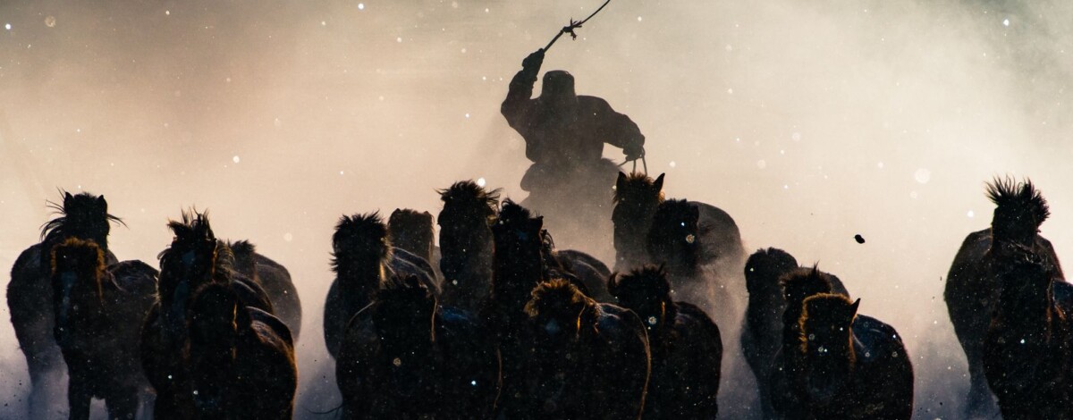 „Iarna în Mongolia Interioară este extrem de necruţătoare. La temperaturi de -7 grade sau mai puţin de atât, cu furtuni constante de zăpadă din toate direcţiilor, mi-a fost destul de greu să ies din maşină pentru a face aceste imagini – până am văzut caii aprigi. Cu rapiditate mi-am înfăşcat aparatul de fotografiat şi am prins momentul în care unul dintre călăreţi a ieşit din ceaţa dimineţii.